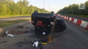 После столкновения легковушка опрокинулась посреди дороги.
